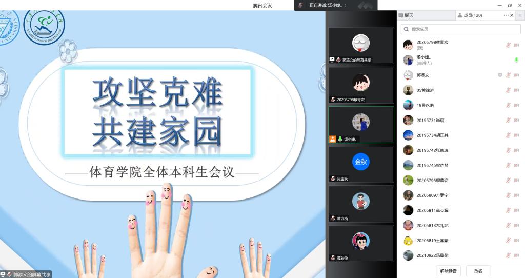 11月17日,52AV 2022级召开了主题为“共克时艰 抗击疫情”的主题班会,本次班会由辅导员汤婕老师主持,2022级体育教育专业全体本科生参加。本次会议采取线上会议的形式进行。首先,汤婕对竹园五栋的同学们进行了解封后的安全提醒:出行必须佩戴口罩,保持一米社交距离,勤洗手等等。并告诉同学们,一定要勤加锻炼身体,保持身体健康。汤婕对此会议进行了录制,并转发给部分在外因特殊原因未能参会的同学。同时,学院给同学们发...
