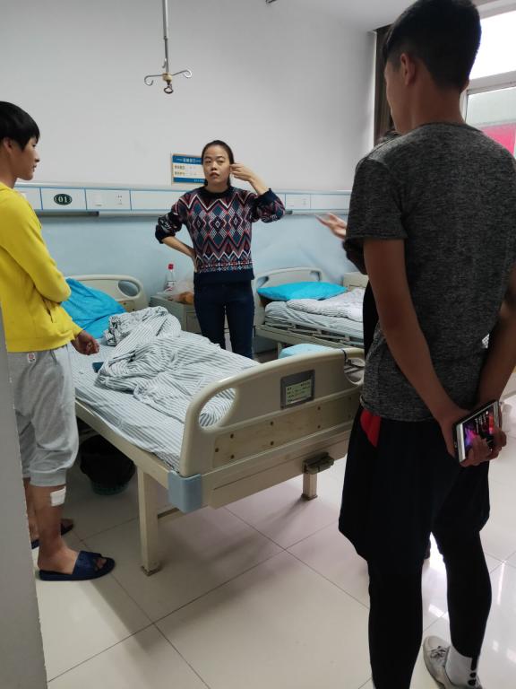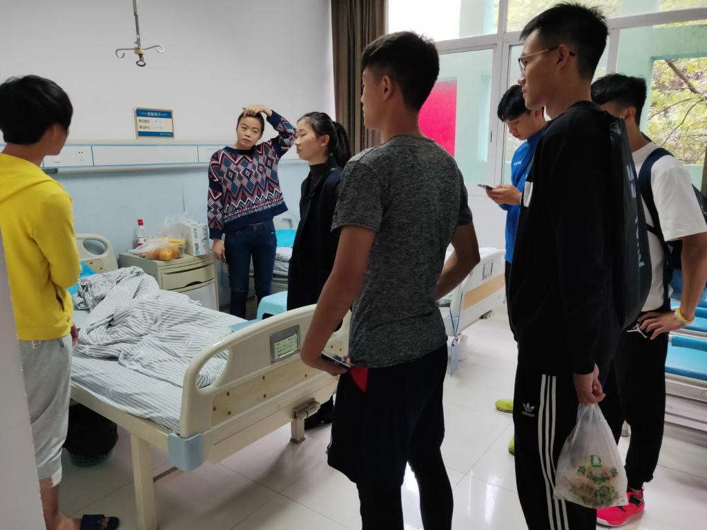 校医院看望因病住院的同学。