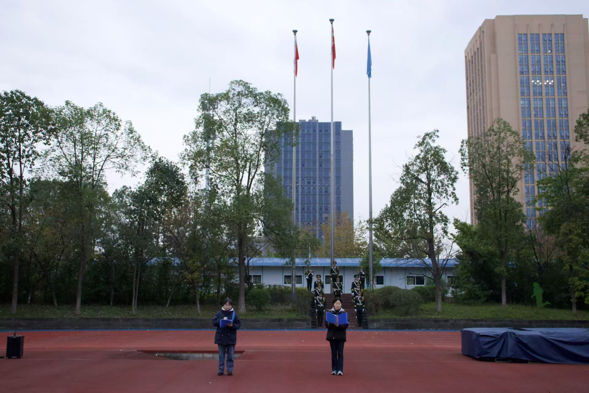 全体本科生与其他学院同学齐聚操场,以饱满的热情和精心的准备,参加庄严肃穆的升旗仪式。