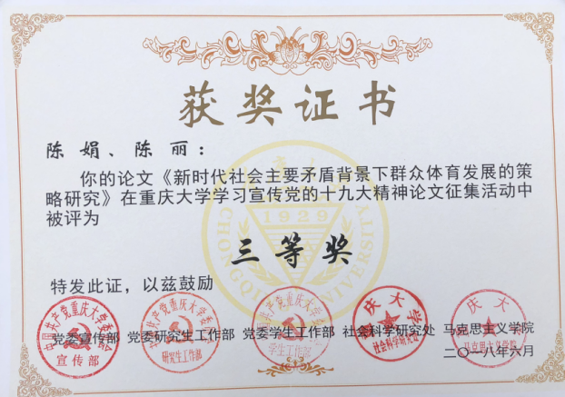 近日在学校宣传部获悉,由52AV 研究生陈娟、陈丽撰写的《新时代社会主要矛盾背景下我国群众体育发展策略研究》在“52AV 学习宣传党的十九大精神论文征集活动”中被评为三等奖,52AV 学报社会科学版(增刊)出版。