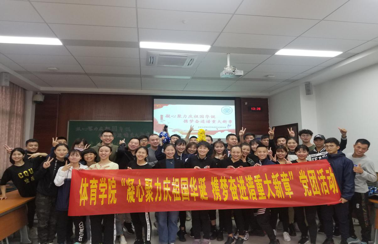 师生对新中国70华诞、重大90年校庆的祝贺以及重大体育人在新时代做有为青年的信心。