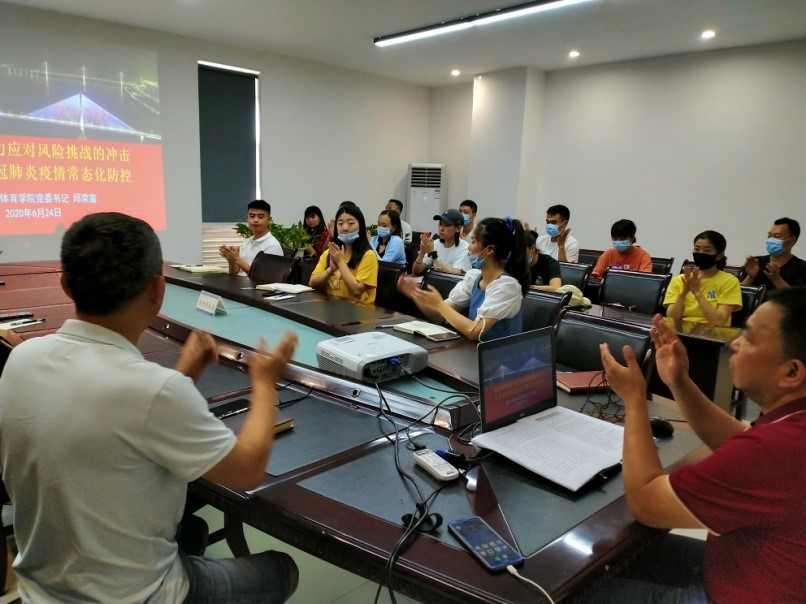 211会议室,为学院全体毕业生党员和2019-2020学年度新发展的预备党员讲了题为“运用制度威力应对风险挑战的冲击,扎实做好新冠肺炎疫情常态化防控”的专题党课。学院组织员陈亭、本科生党支部书记汤婕、研究生党支部书记尚家敏等同志也一起聆听了党课。专题党课由学院党委副书记李永同志主持。