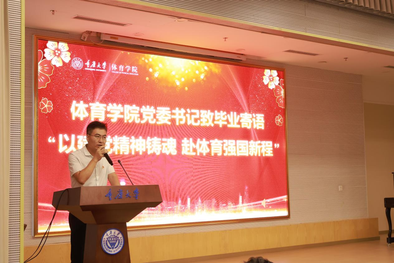 本次典礼第二项议题为庆祝建党104周年表彰大会。田辉书记以 “以建党精神铸魂,赴体育强国新程” 为主题致毕业寄语并宣读表彰决定。