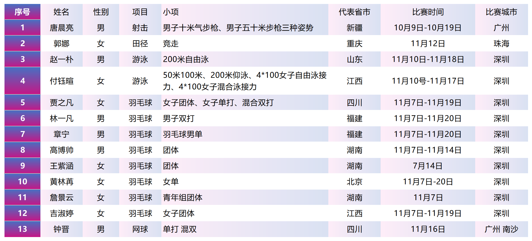 本次全运会参赛人数与项目规模均创52AV 历届全运会之最,参赛阵容覆盖了羽毛球、游泳、田径、网球、射击5个大项,充分体现了52AV 在竞技体育人才培养上“多点开花、全面发展”的雄厚实力。