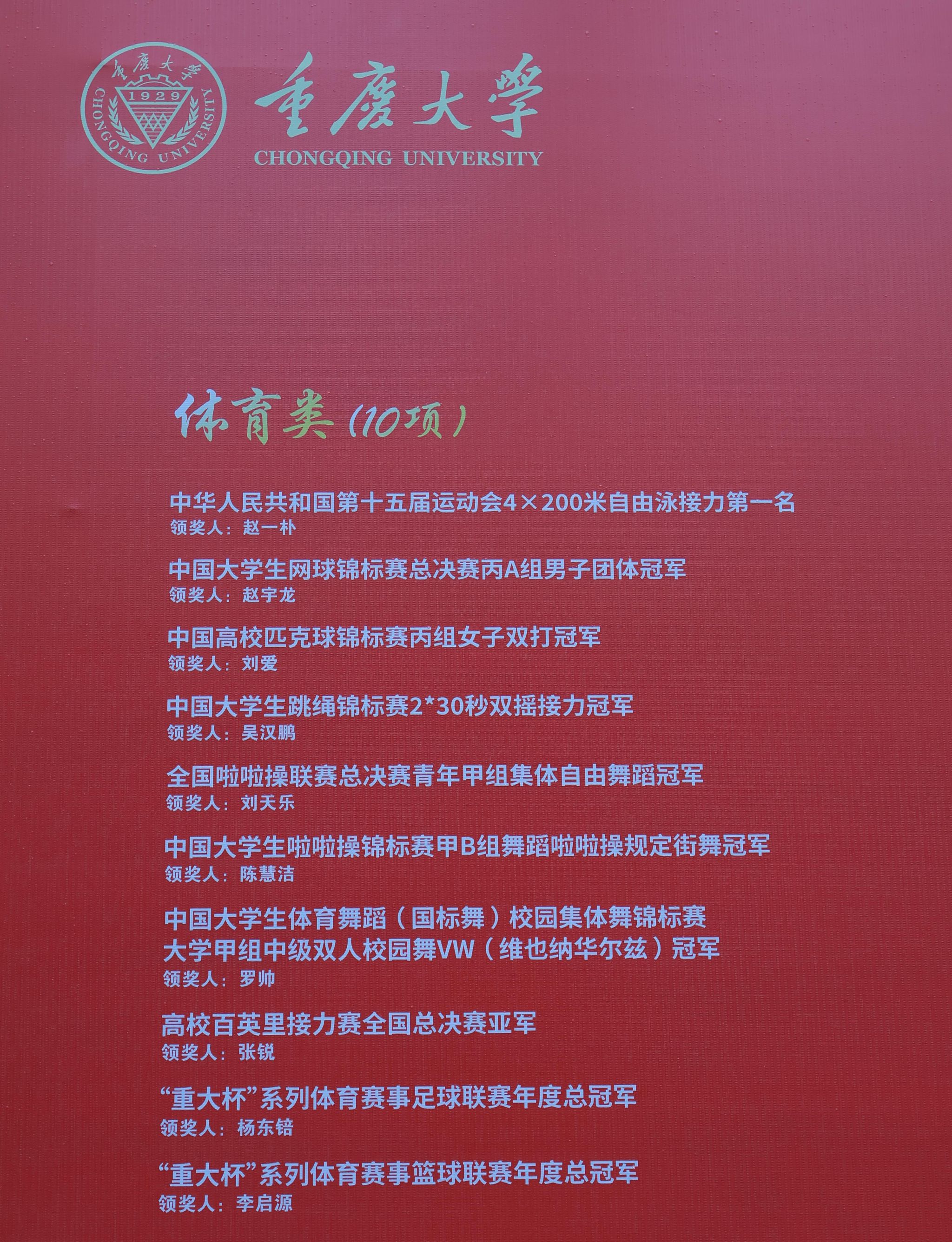 体育类获奖学生包括在第十五届全国运动会中勇夺男子4×200米自由泳接力冠军的赵一朴,以及在中国大学生网球锦标赛、中国高校匹克球锦标赛、全国啦啦操联赛、中国大学生啦啦操锦标赛、中国大学生体育舞蹈锦标赛、高校百英里接力赛等一系列国家级高水平赛事中摘金夺银的李尚辉、高乙埔、罗晨浩、赵宇龙、刘爱、杨淼淼、吴汉鹏、刘天乐、陈慧洁等同学。他们不仅为学校赢得了荣誉,更彰显了重大体育人顽强拼搏、团结协作、追求卓越的精神风貌。