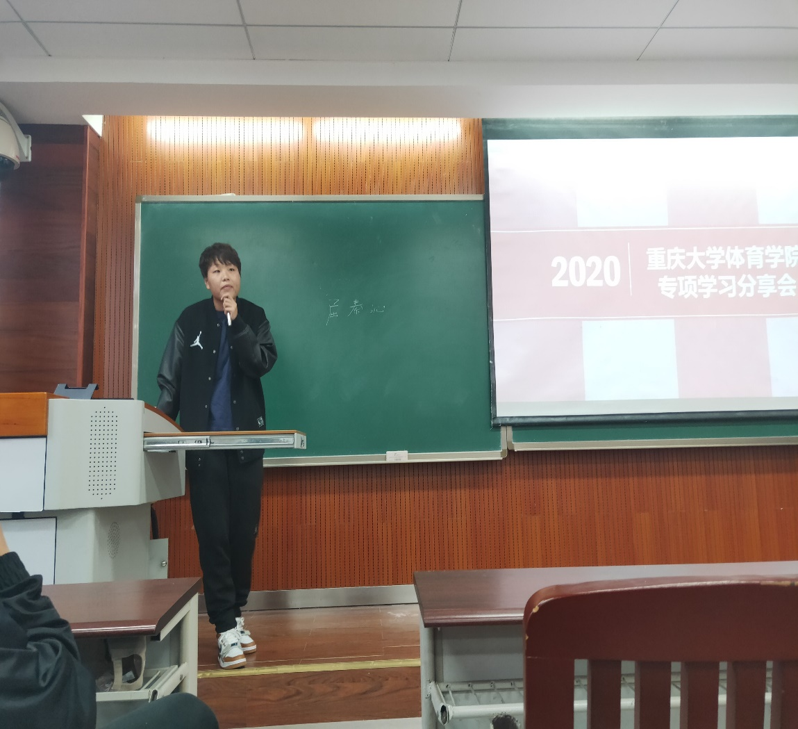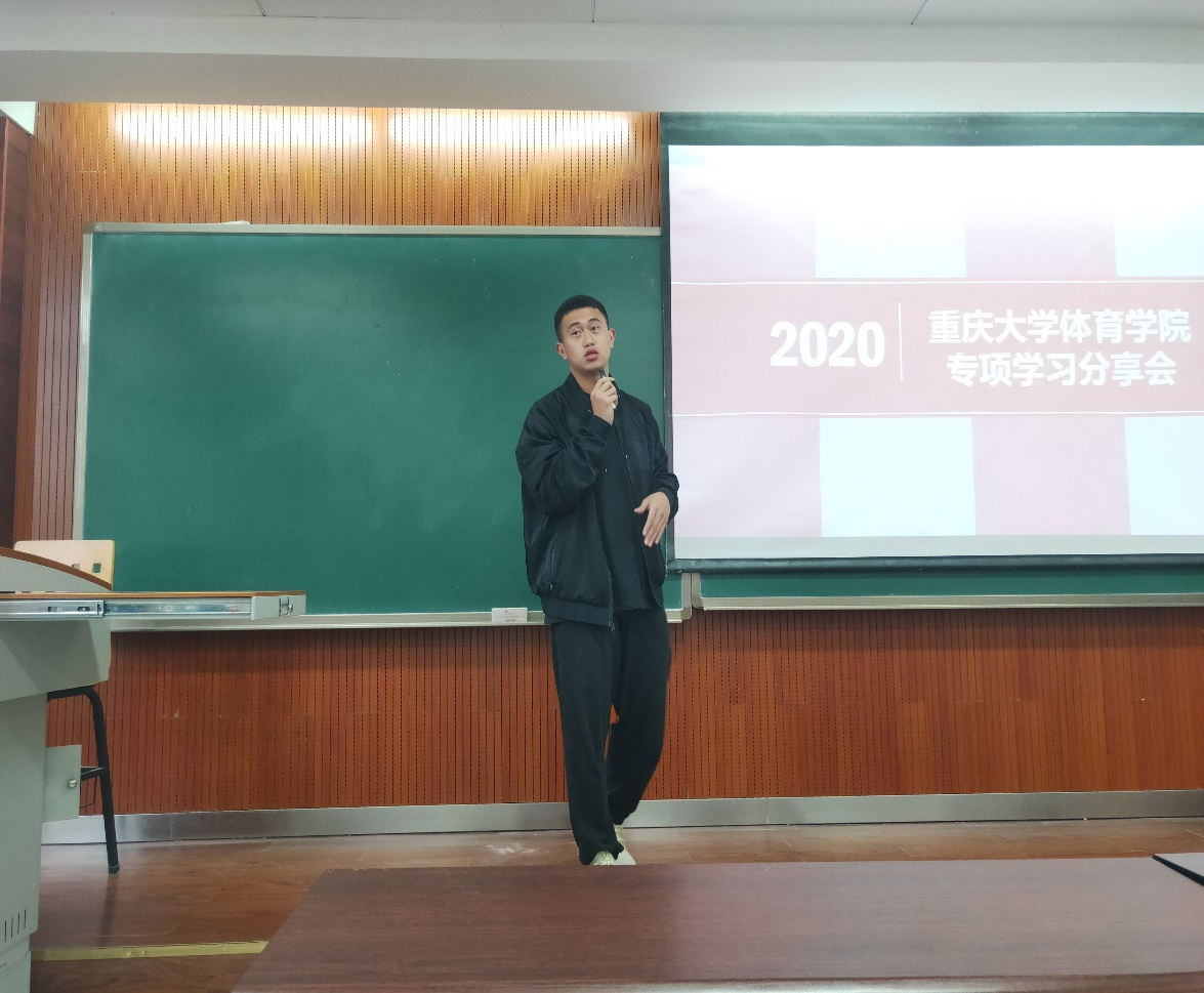 对于篮球专项的学习,谭笔升首先介绍了一些自己的亲身经历,同时提出了一些自己在平时相处当中发现存在的不足之处,例如:在专选班训练中班级凝聚力不足;对理论知识的重视度不够;过分注重技术能力从而忽略教学能力等等。最后他还分享了拓展个人能力方面的一些简单易行方法。他的分享交流从专项学习、裁判工作、人际交往和教学经验积累等方面给同学们带来了宝贵的经验。