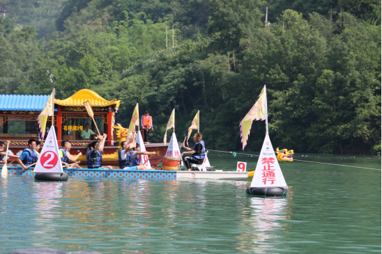8日早晨,所有队员六点就起来开始准备,六点半到宾馆楼下集合吃好早餐踏上去赛场的路。明媚的阳光、清新的大自然空气以及葱绿的树木营造出了一个非常舒适的比赛环境。二十二人的龙舟赛,一个鼓手,一个舵手,二十个划手,舵手掌控划行的方向,鼓手带动全体队员的节奏,而在龙舟赛中队员们统一节奏整齐划一的划行是非常重要的。赛中队员们跟着鼓声有节奏的“一 二、一 二”的呐喊,奋起划桨,浪花飞溅。此次龙舟赛不仅代表着对传统文化的继承,还体现了团结奋进的团队精神。