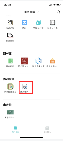 (4)同学们选择顶端“我的大学”进入校内板块服务,选择体测服务的“体测预约”服务,然后点击进入,如图所示: