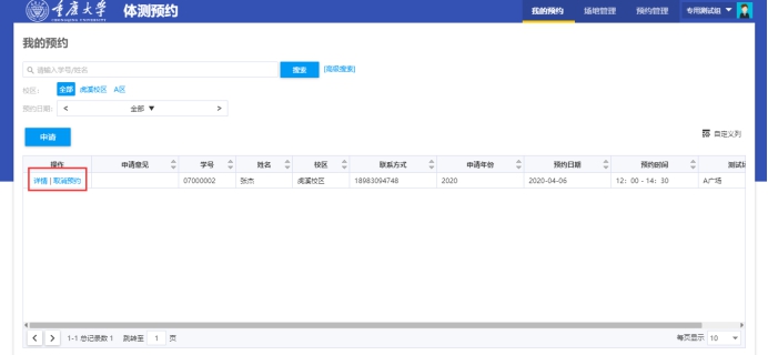 4)“我的预约”页面增加一条体测预约记录,在体测管理老师没有确认前,可以取消预约,如图所示: