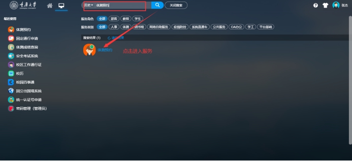 2)进入网上服务大厅,在顶端搜索框内输入“体测预约”,点击应用进入服务,如图所示: