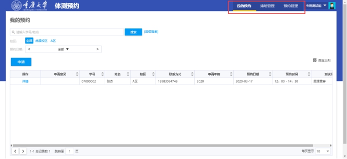 我的预约为学生使用,场地管理为应用管理员使用,预约管理为预约审核老师使用