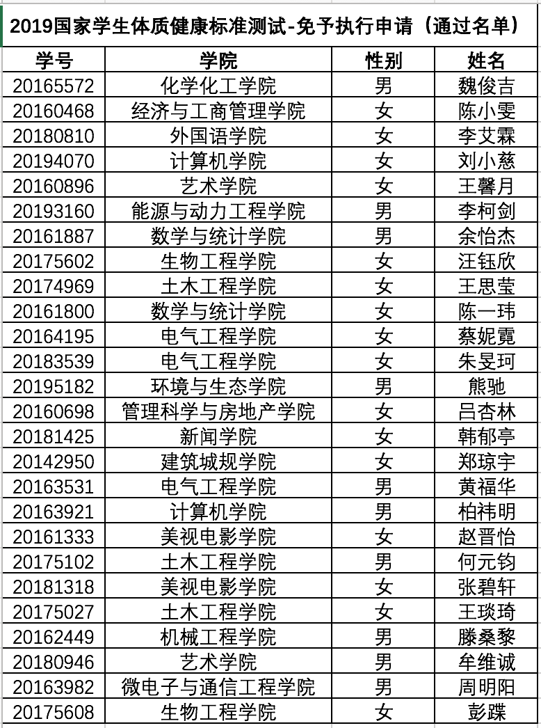 关于2019年52AV 国家学生体质健康标准测试-免予执行申请通过名单公示