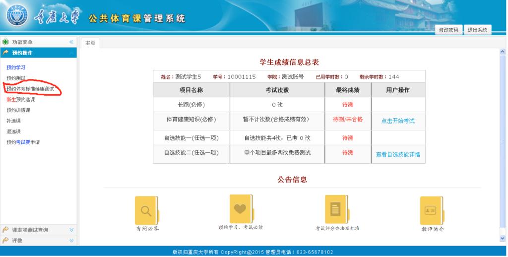 当周预约下一周的体质健康标准测试;测试时间分布在周一至周五中午及周六三个时段;由于天气或预约人数过少原因有可能预约失败,学生预约后可于当周星期天查看预约成功与否,预约不成功,下周可继续预约;